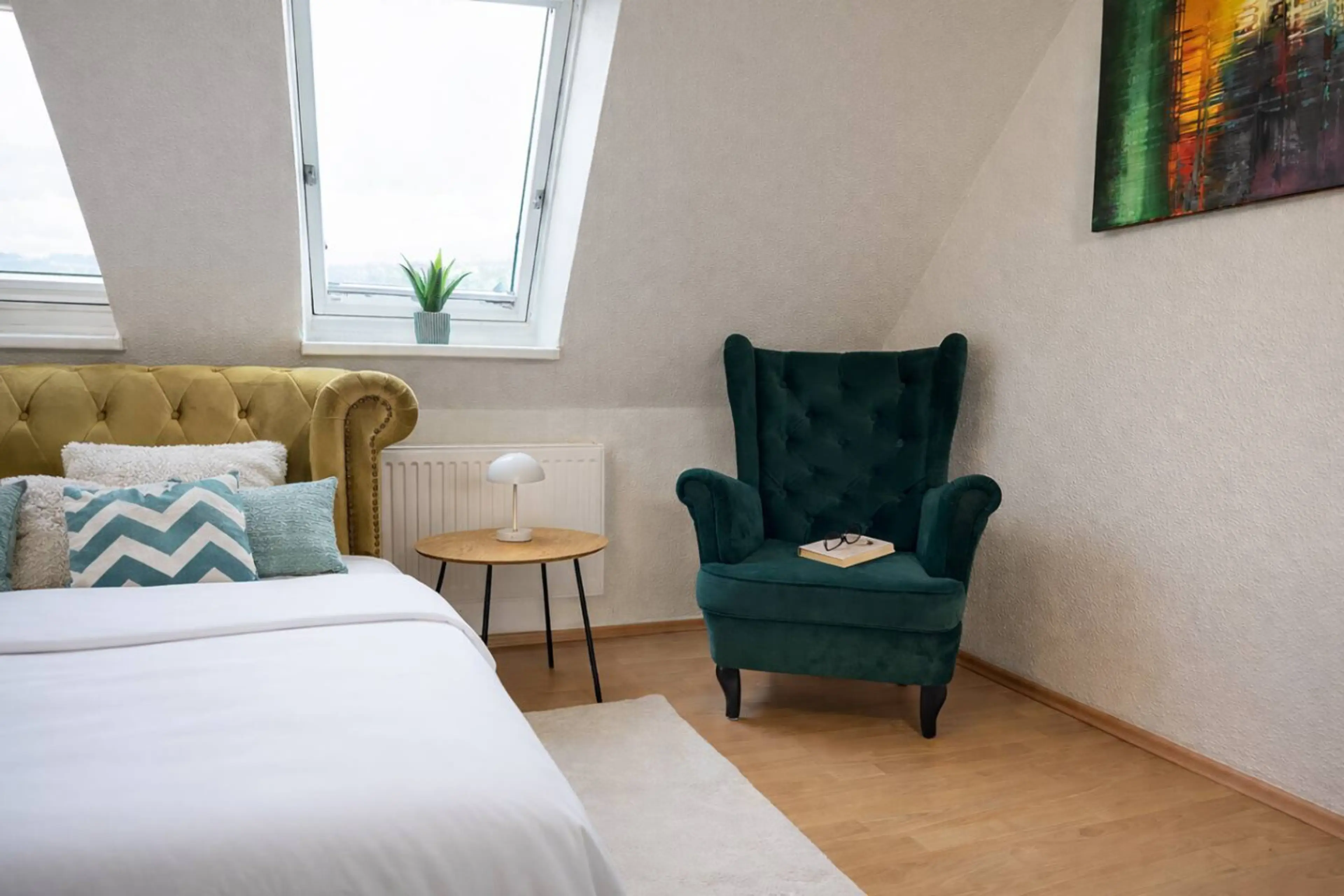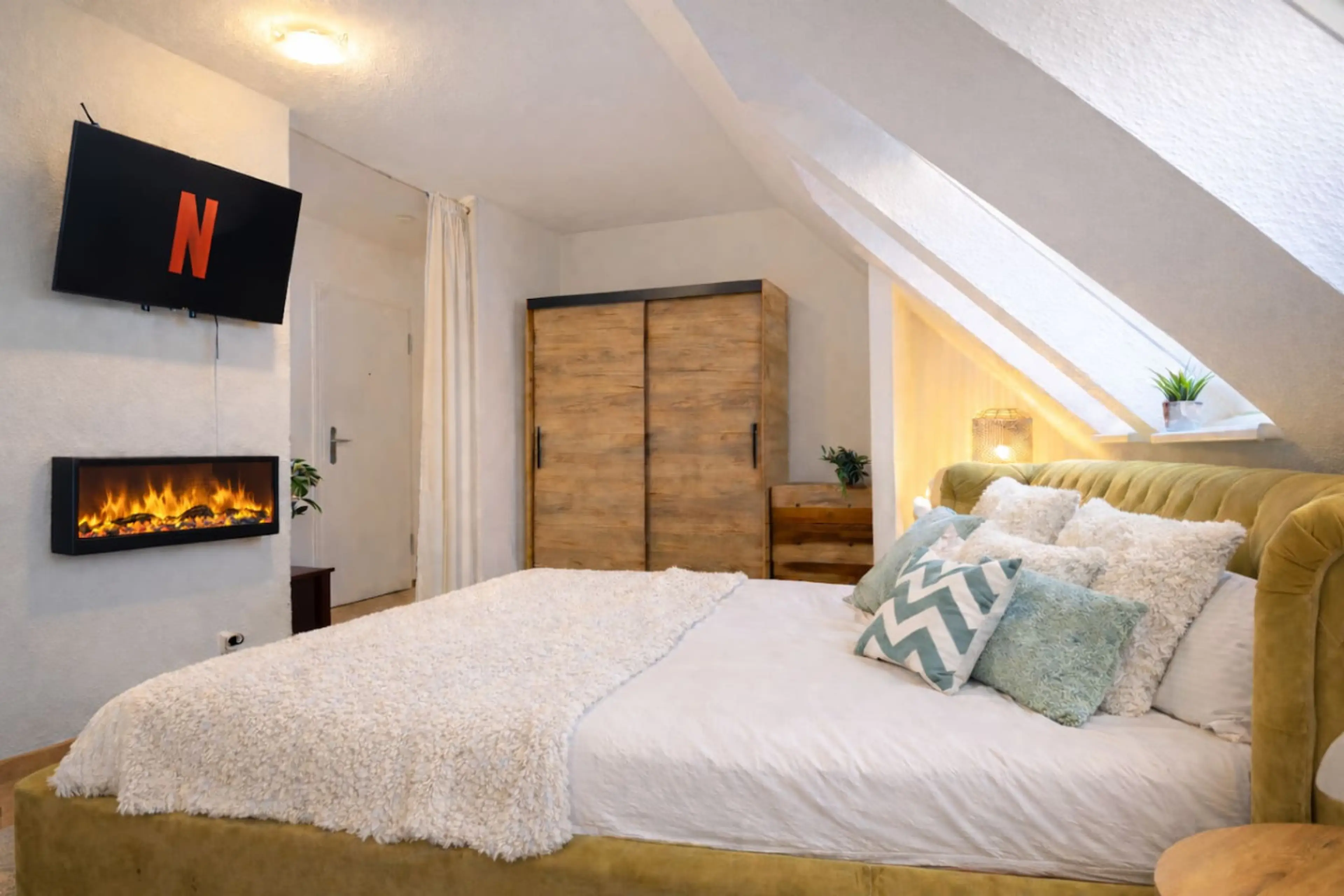 Willkommen in deinem stilvollen 45 m² großen Deluxe DG Apartment im Herzen Schwerins! Dieses Apartment vereint modernen Komfort und durchdachte Annehmlichkeiten – perfekt für Geschäftsreisende und Freizeitgäste. Genieße erholsame Nächte im gemütlichen Schlafzimmer, entspanne im einladenden Wohnberei...